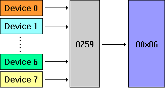 Although the 8086 processor is designed to handle up to eight external devices, there is only a single interrupt line connecting the processor to the outside world, meaning that without some form of additional hardware, at most one external device can be connected to the processor. Fortunately, hardware such as the Intel 8259 Interrupt Controller has been designed to share the single interrupt line between eight different devices. The following figure shows the relationship between the devices, the 8259, and the 8086 processor: