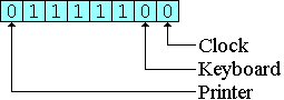 A bit value of one in the interrupt mask indicates that any interrupts coming from the device are to be ignored, while a bit value of zero means that the device is allowed to interrupt the 8086. For example, to permit clock, keyboard, and printer interrupts, the interrupt mask would be set to 0x7C, as shown in the following figure: