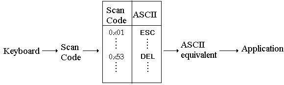 IBM has defined a scan code for each key (to remain compatible with the IBM PC; keyboards built by other manufacturers must generate scan codes that correspond to those found on the IBM PC, regardless of where the keys are placed on the keyboard). For example, the Escape key (Esc) generates scan code 0x01, while the Delete key (Del) generates scan code 0x53. Since the value of the scan codes do not correspond to a specific character code (such as ASCII or EBCDIC), the scan code must be translated into the character code required by the application. The translation is done through software within the processor, mapping the scan code into the equivalent character code character, typically using a translation (or mapping) table as shown in the following figure: