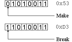 The processor is signalled twice whenever a key is touched: once when the key is pressed (generating the make scan code), and once when the key is released (generating the break scan code). Regardless of whether the scan code is a make or a break, the lower seven bits of the scan code identify the key. The eighth bit is cleared by the keyboard to indicate a make and is set to signal a break. For example, in the following figure, the make scan code for the Delete key (generated when the Del key is pressed) is 0x53, while the break scan code (generated when the Del key is released) is 0xD3.