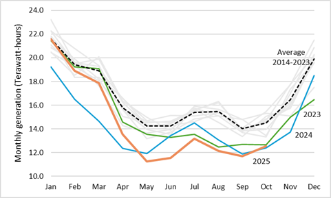 Hydro Québec's monthly generation from 2014 to October 2025 (Author's chart; Data from StatsCan)